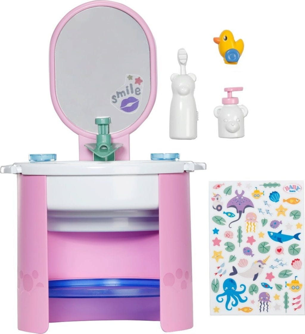 S tem podrobno izdelanim umivalnikom postane vsakodnevna higiena v kopalnici fascinantno doživetje za otroke in njihove lutke. Pametna mehanska črpalka omogoča, da s pritiskom na gumb iz pipe priteče prava voda, kar poskrbi za izjemno realistično igralno vzdušje ob umivanju rok. Priložena zobna ščetka s spretnimi vibracijami zelo prepričljivo posnema delovanje električnega modela. Zabaven zamašek v obliki račke Berte varno zadrži vodo v umivalniku. Z barvitimi nalepkami lahko otroci celoten komplet okrasijo po lastnem okusu in tako ustvarijo povsem svoj kotiček.