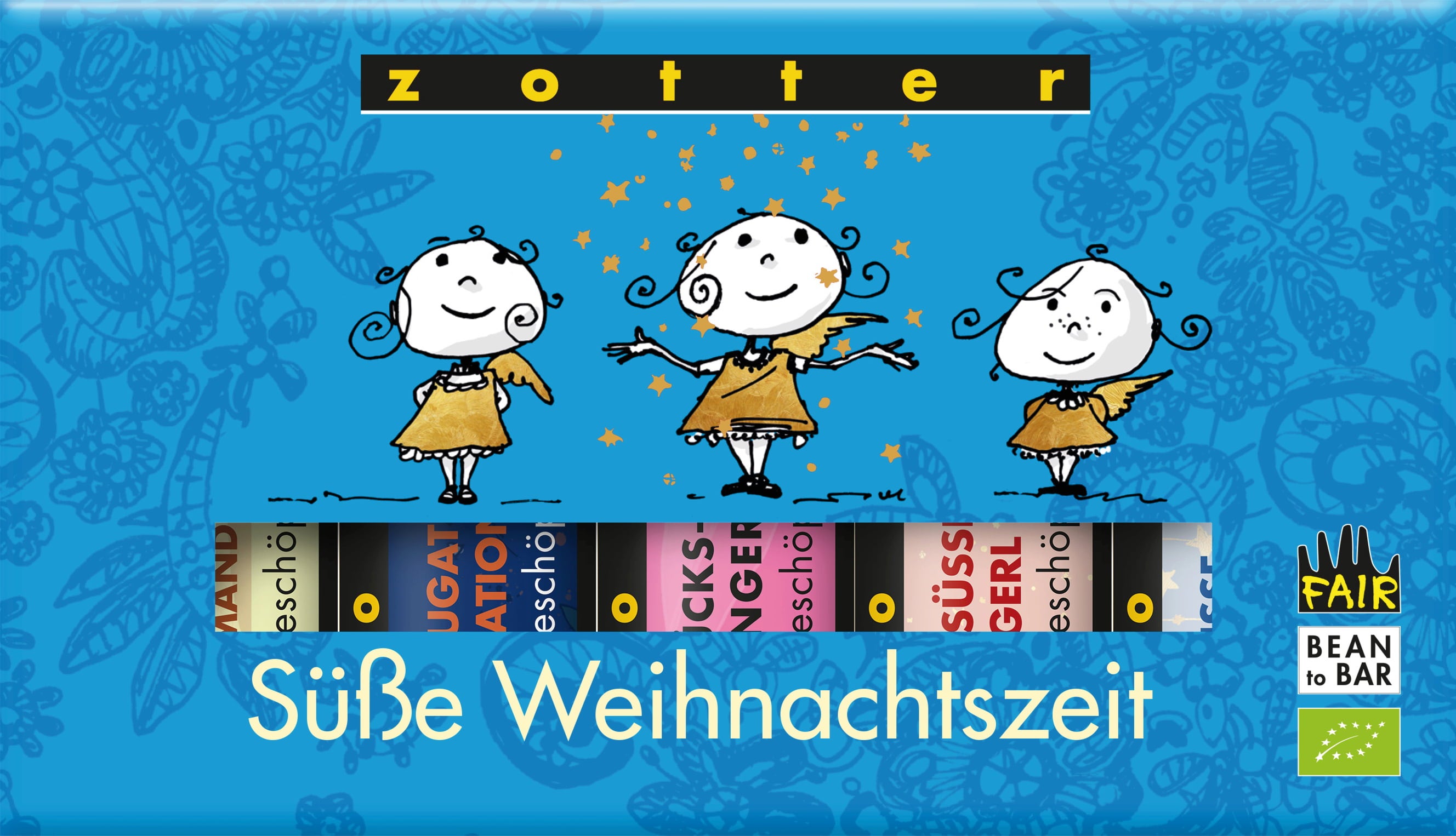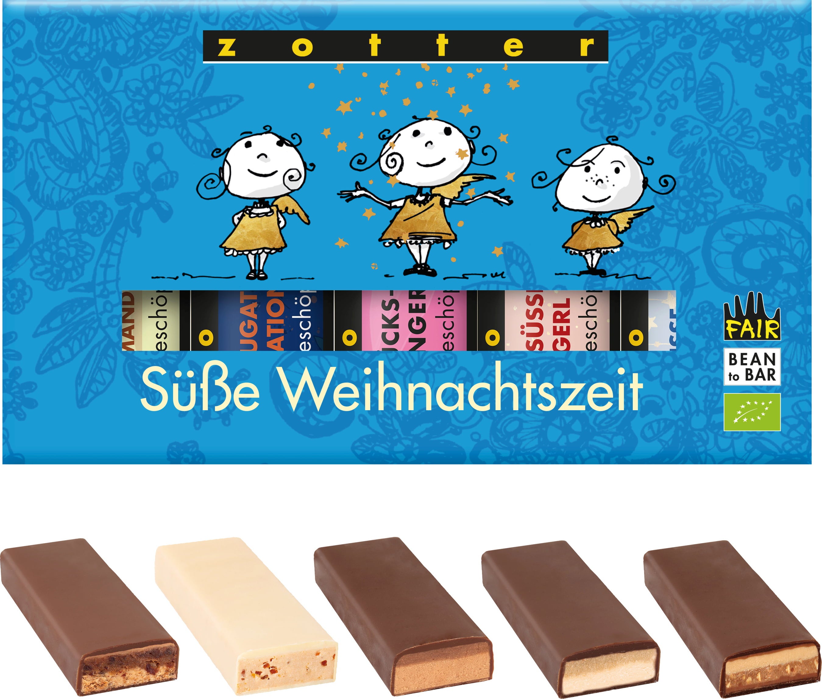 - Za sladke angelčke: Priljubljena sorta "SchokoBiene mit Honigblätchen" (bela čokolada s karamelnim čipsom) v božični obleki.